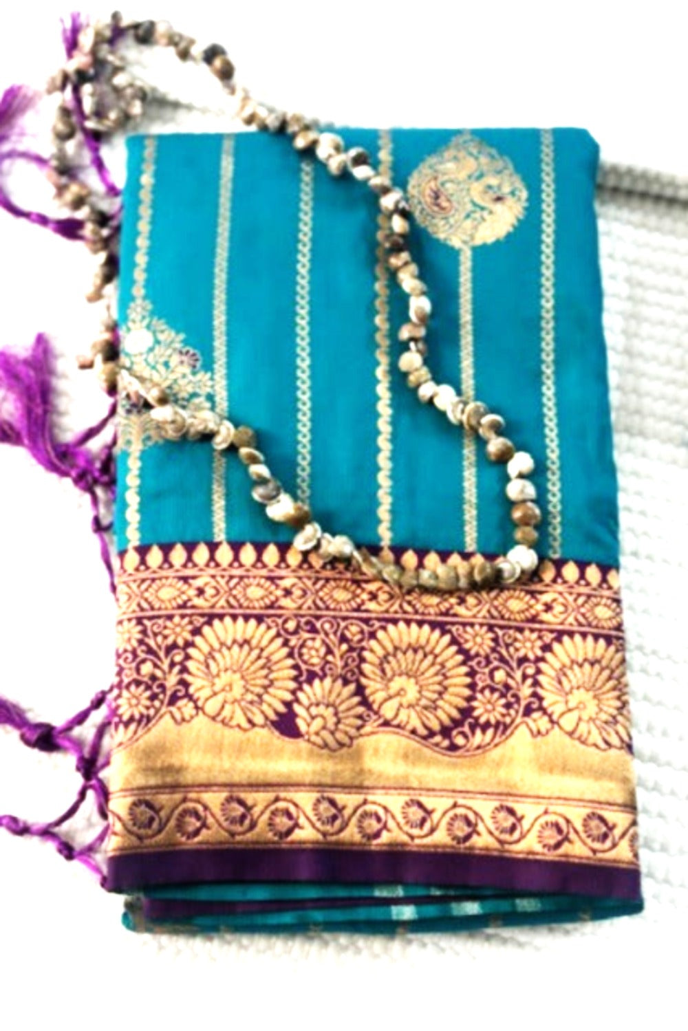 Product Description: Blue Soft Silk Saree with weaving and rich pallu. Saree comes with a blouse piece.