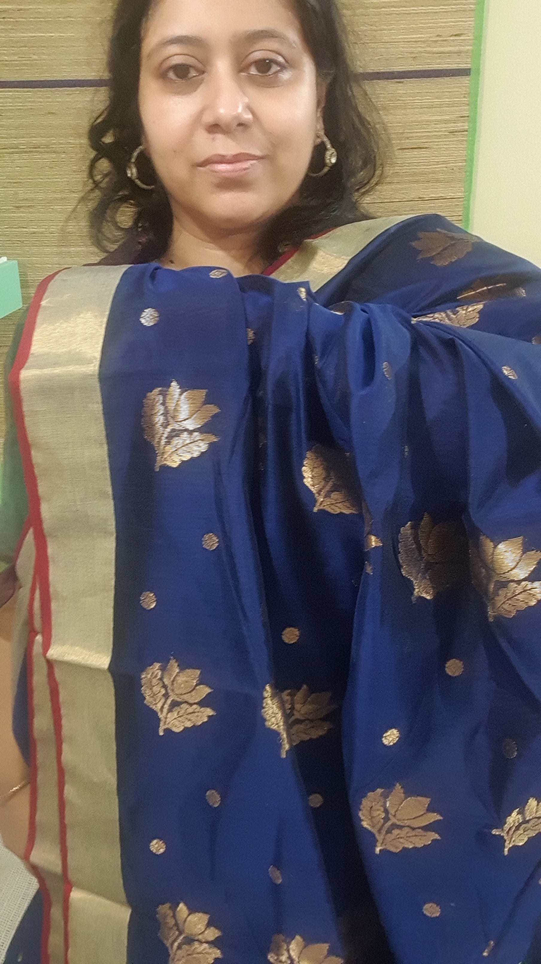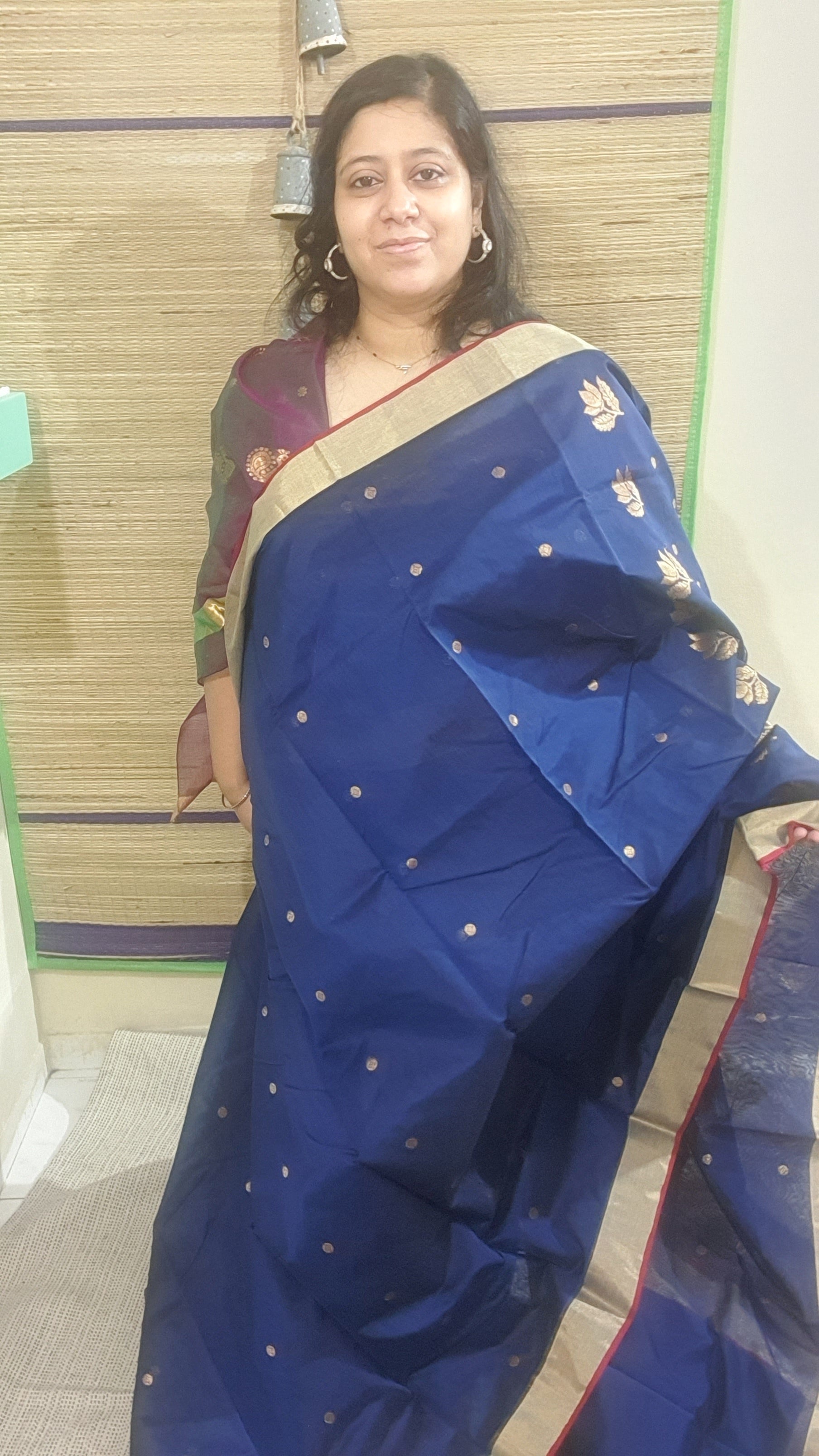 Product: Pure handloom authentic hand-woven saree comes with a small buta motifs woven in saree body. with Flower motifs in pallu. Saree comes with blouse. Very soft light weight easy to carry. Color is Dark Blue.