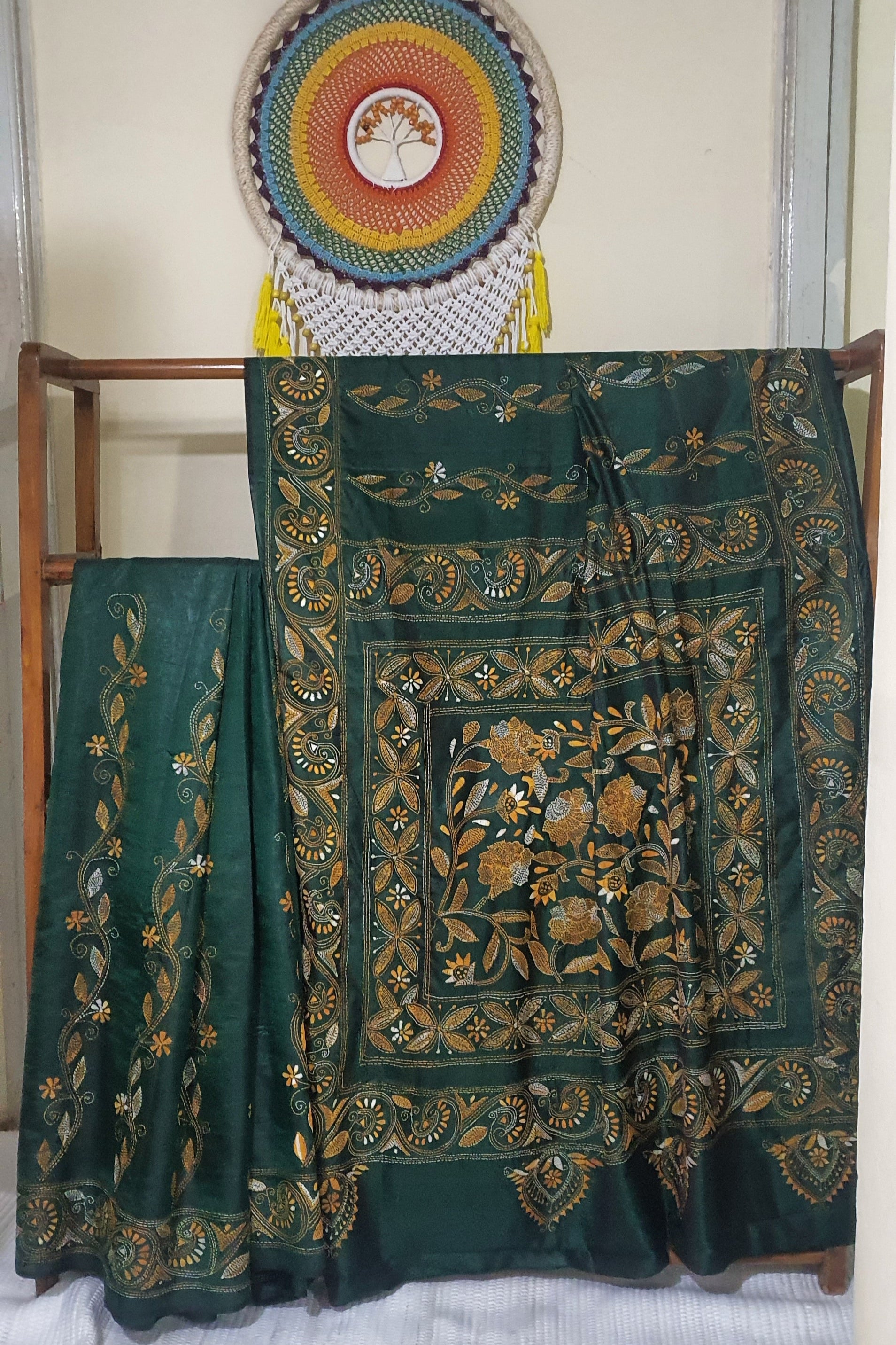 Product : Dark Green saree with Kantha Stitch embroidery in overall body and heavy work in pallu . Very Soft material in touch and feel like a butter. Saree comes with blouse.