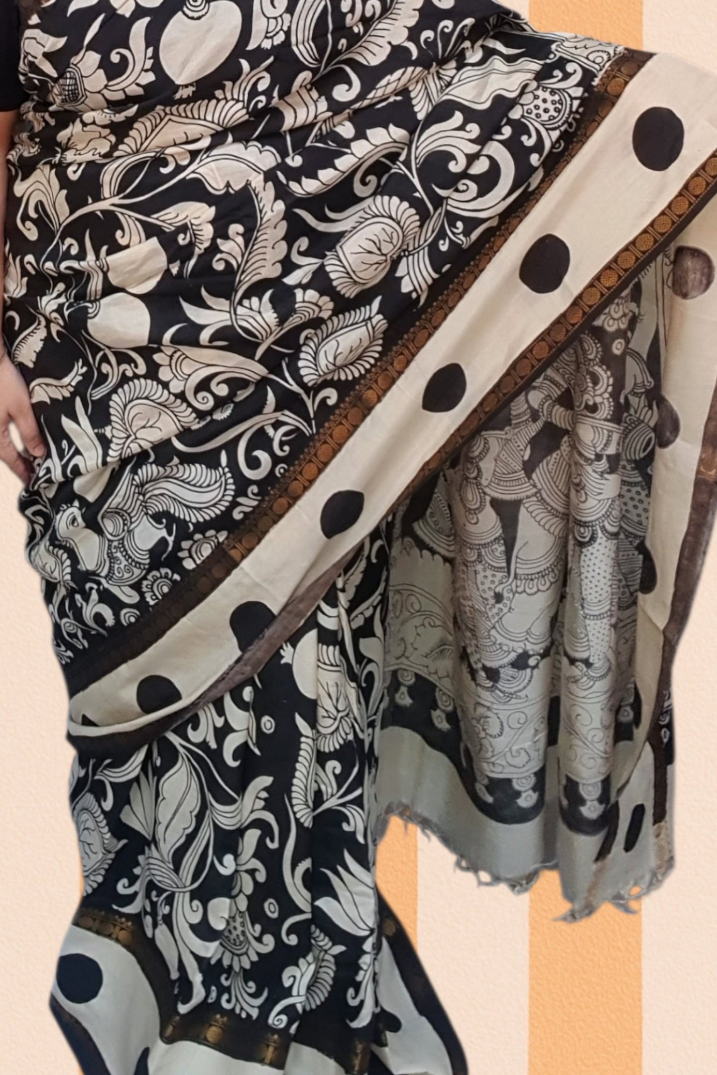 Details: White base saree with all over body and pallu hand painted black ink kalamkari work