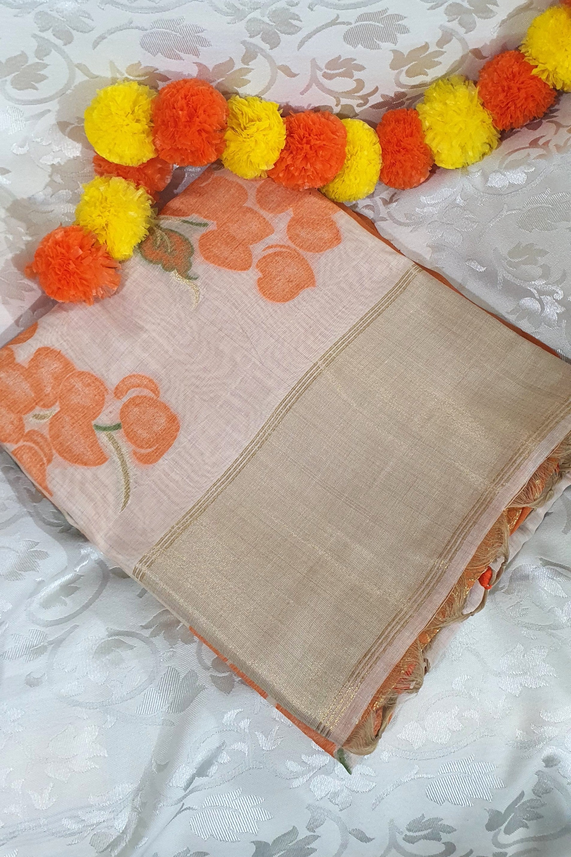 Orange OffWhite Muslin Cotton Saree
