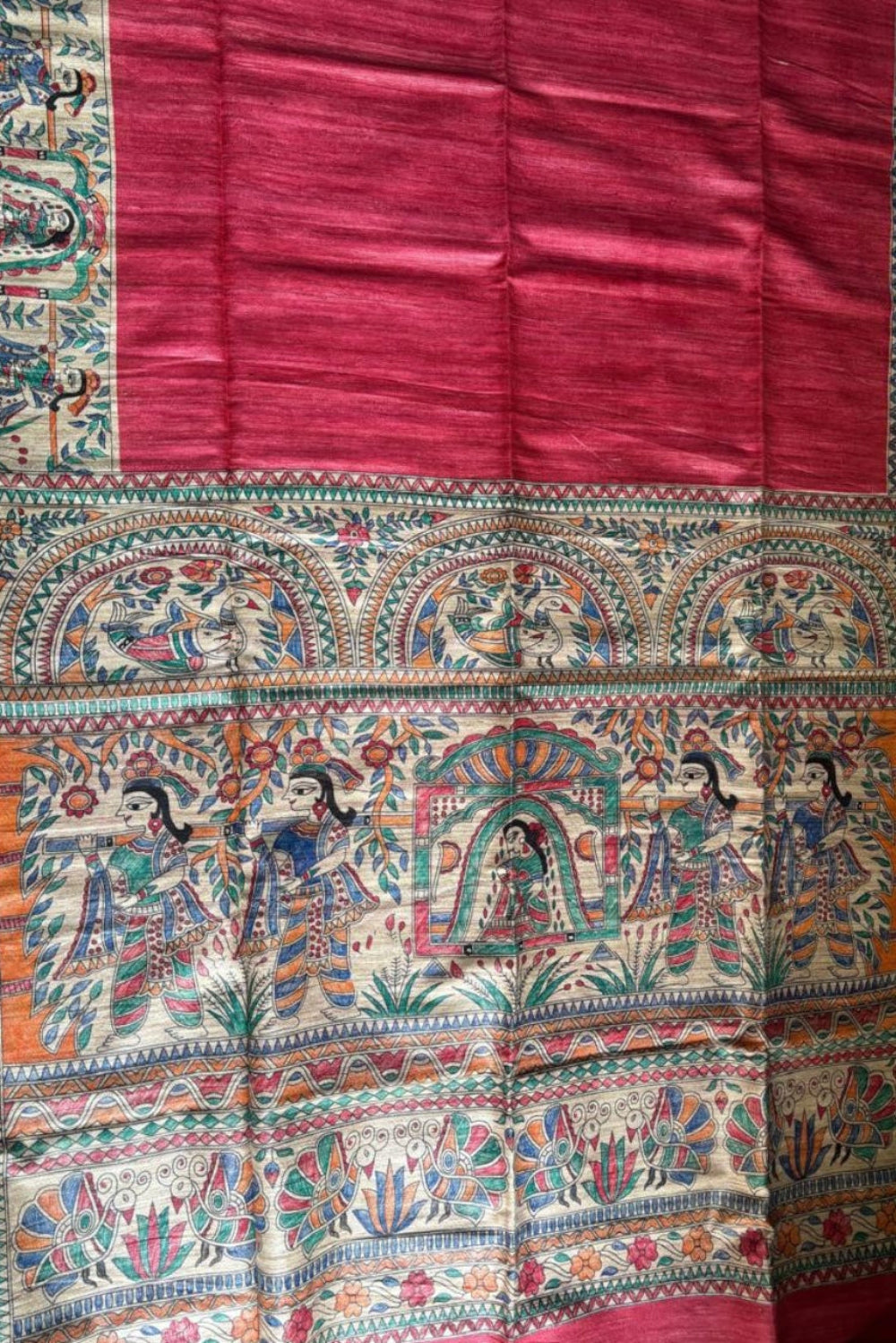 Details: Reddish Pink saree showing a procession of bride in palki by handpainting