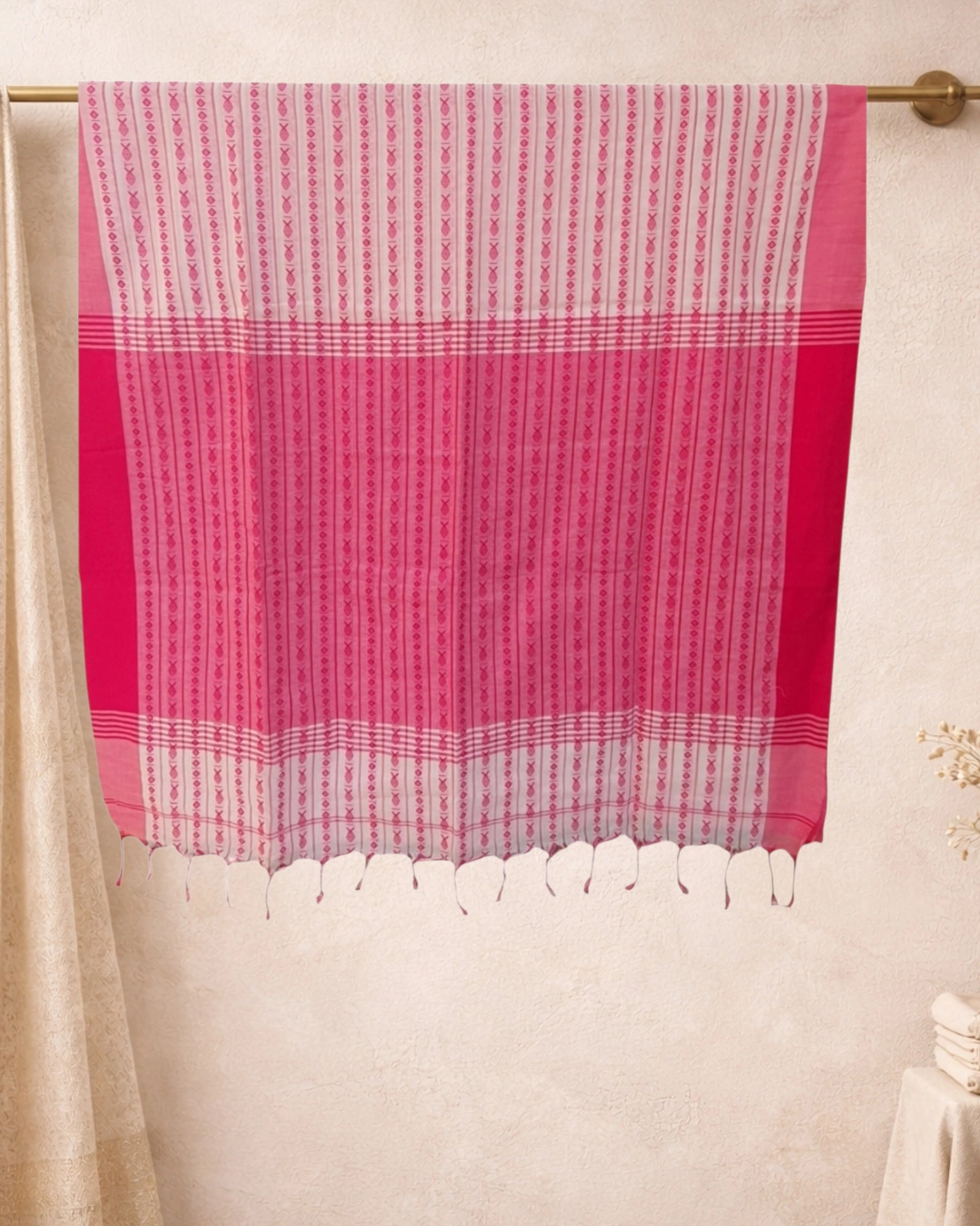 Product: White hot pink pure handloom cotton with weaving all over. Saree comes with blouse piece but suggestion would not to cut it as its pure cotton handloom. Saree is very soft and easy to carry.
