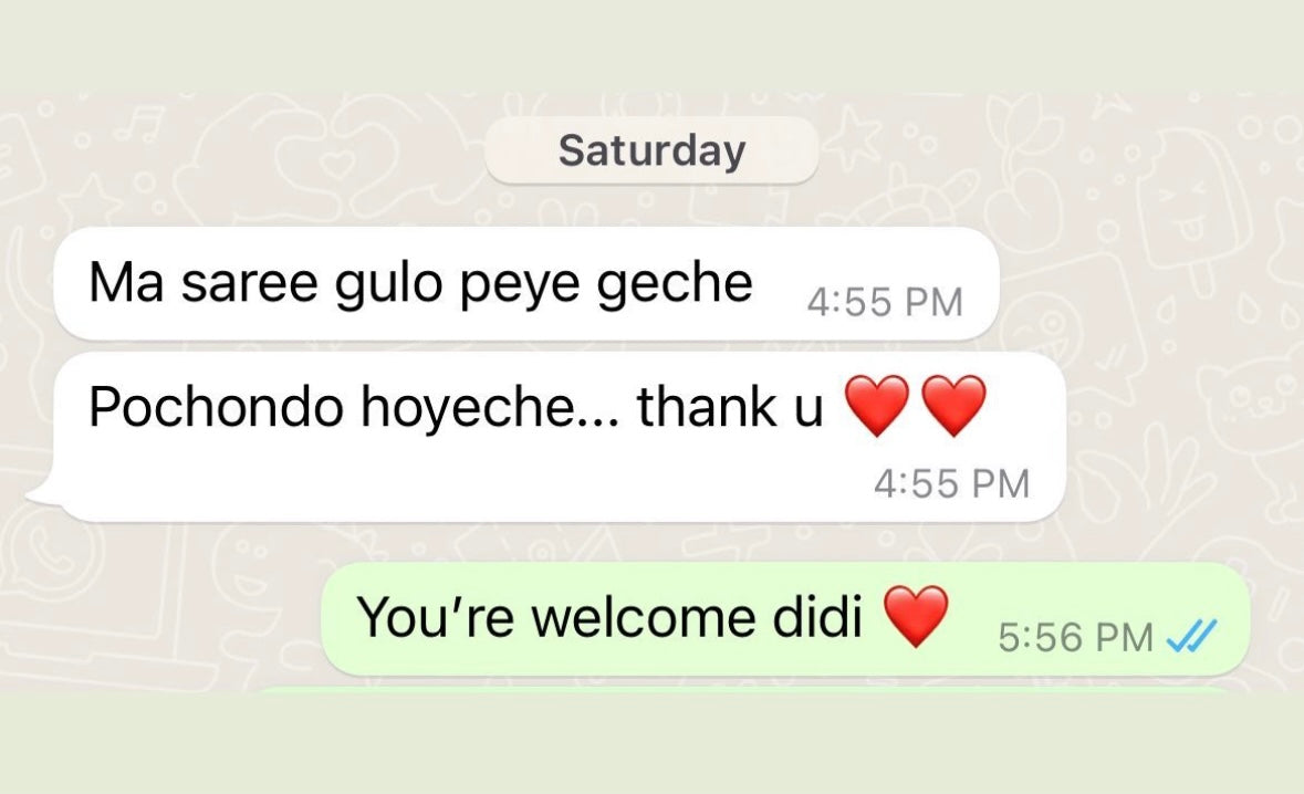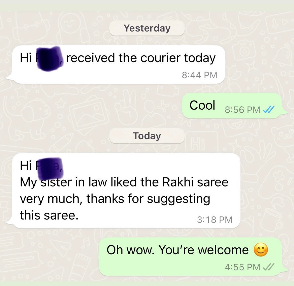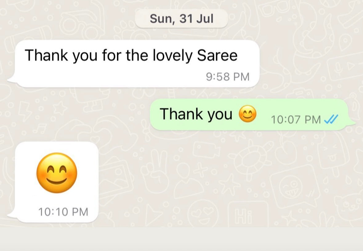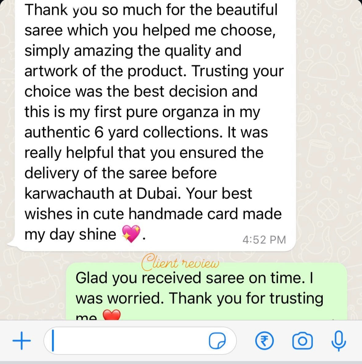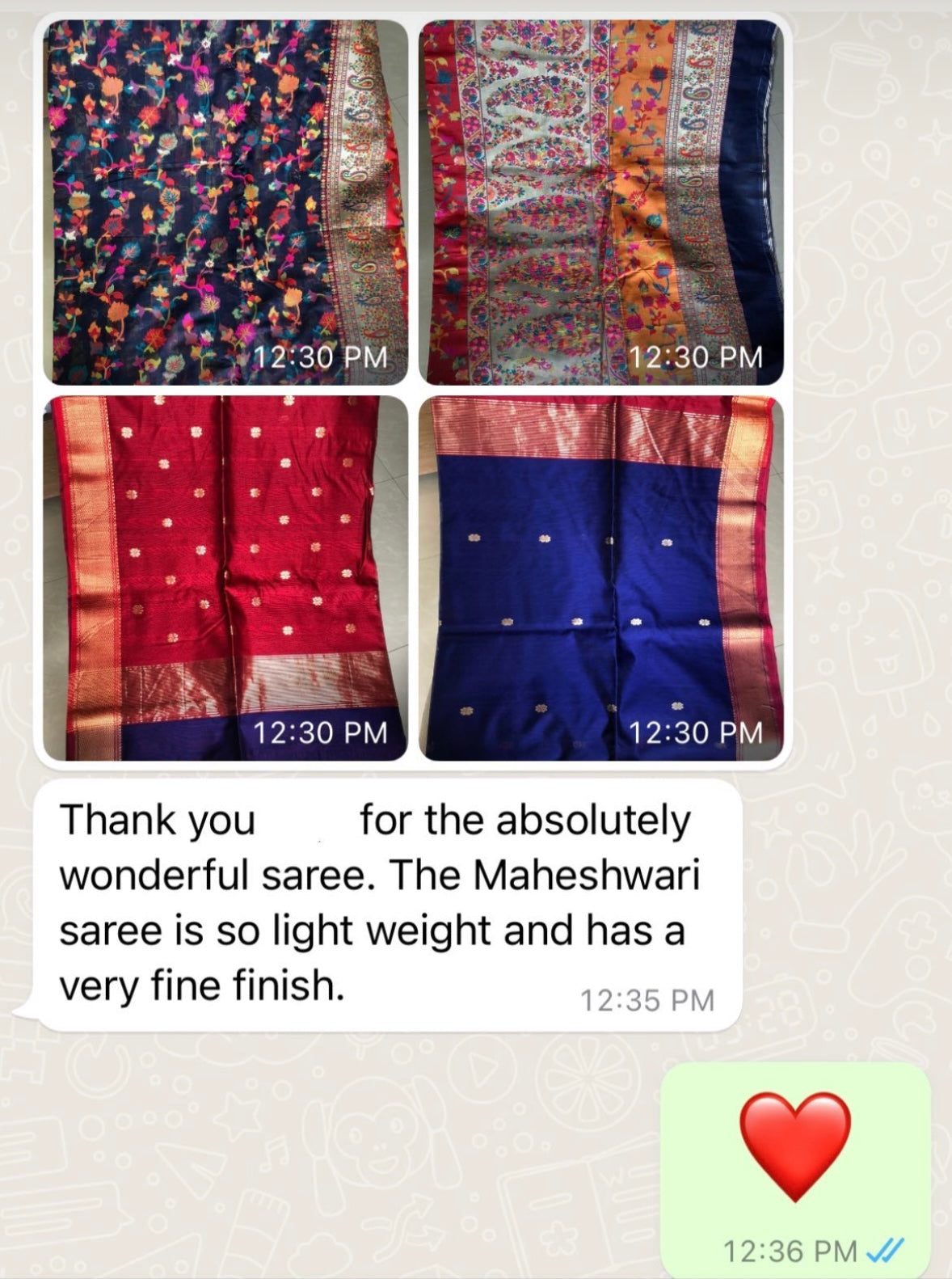 Thank you for being a part of this journey. Every saree we send carries a part of my heart and a wish for your happiness.”